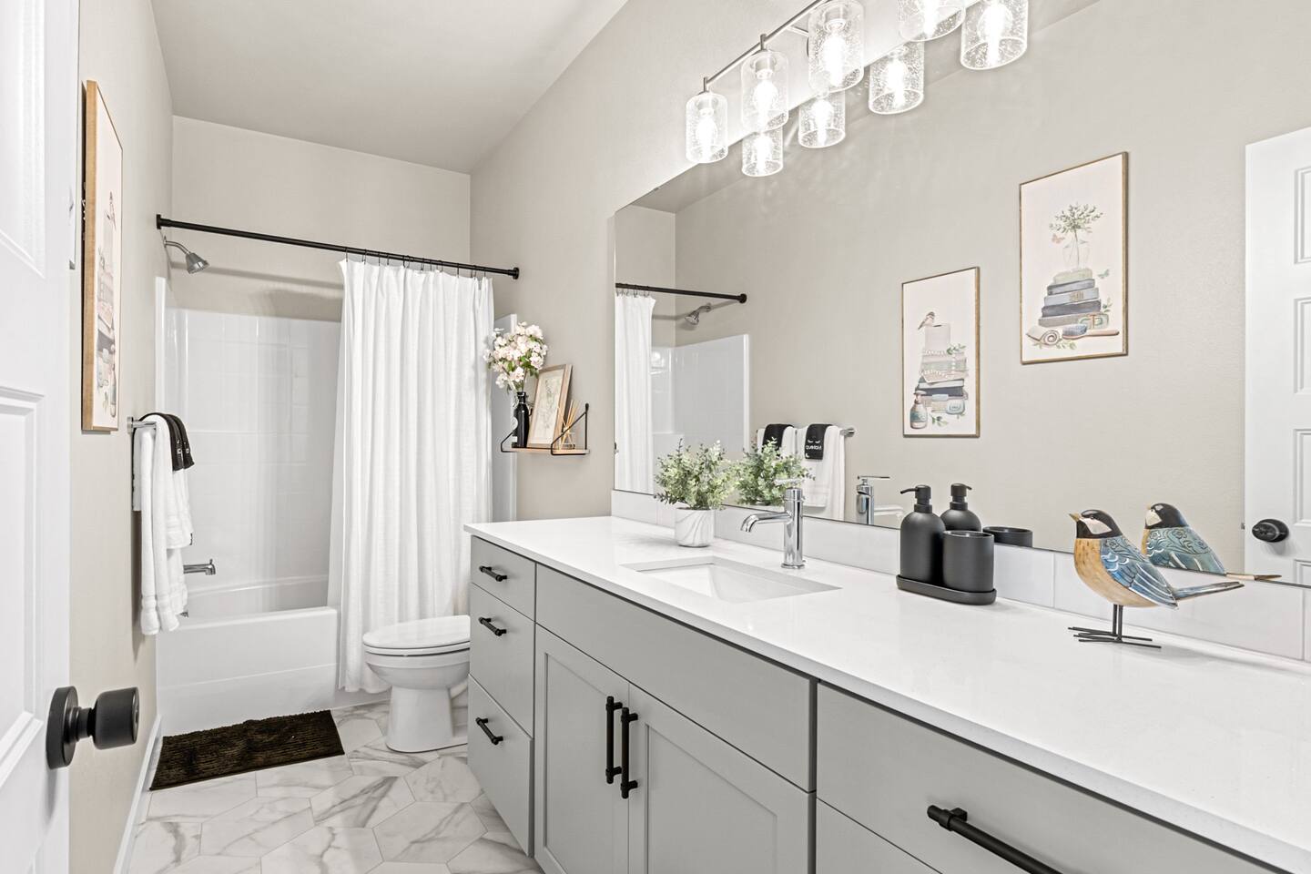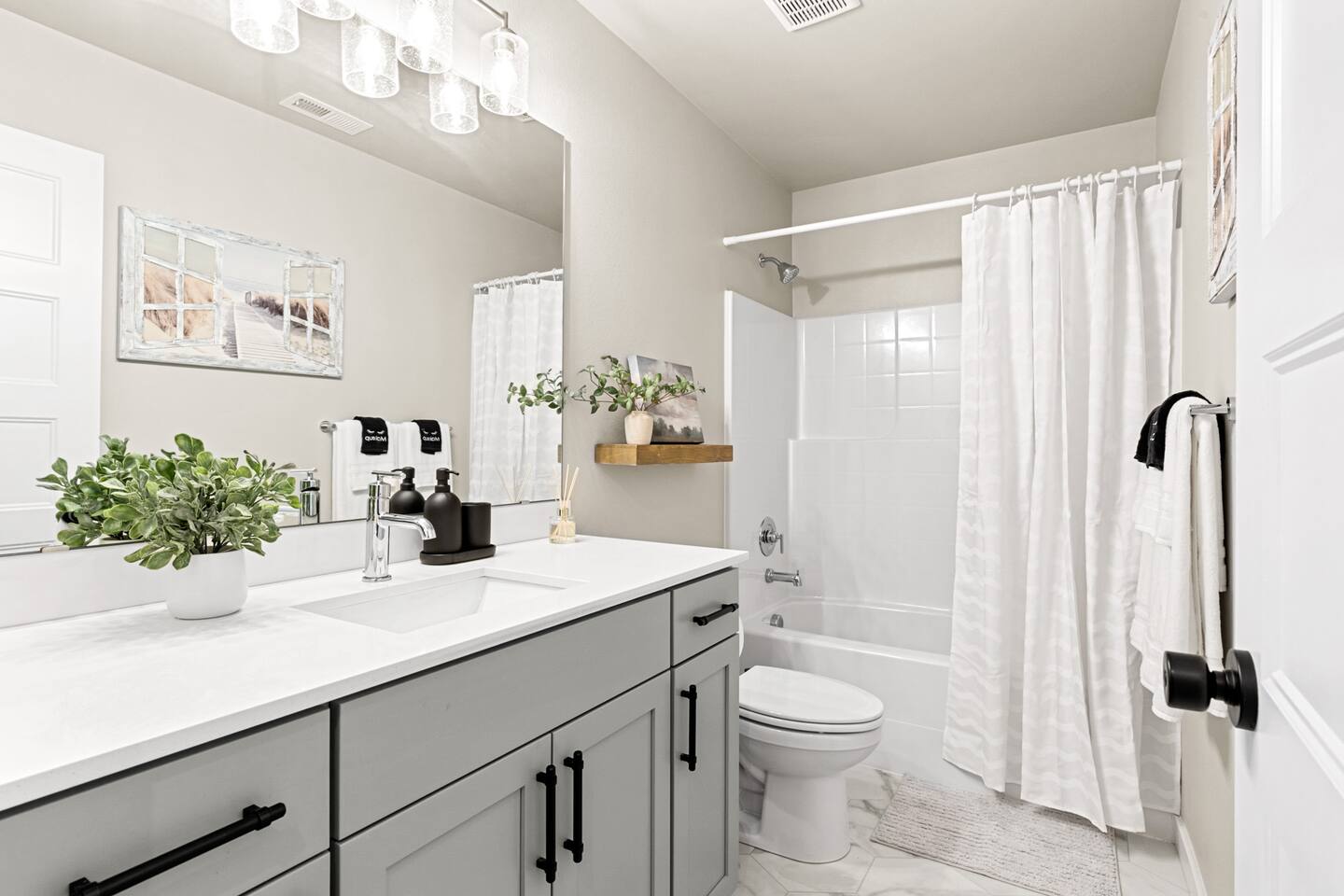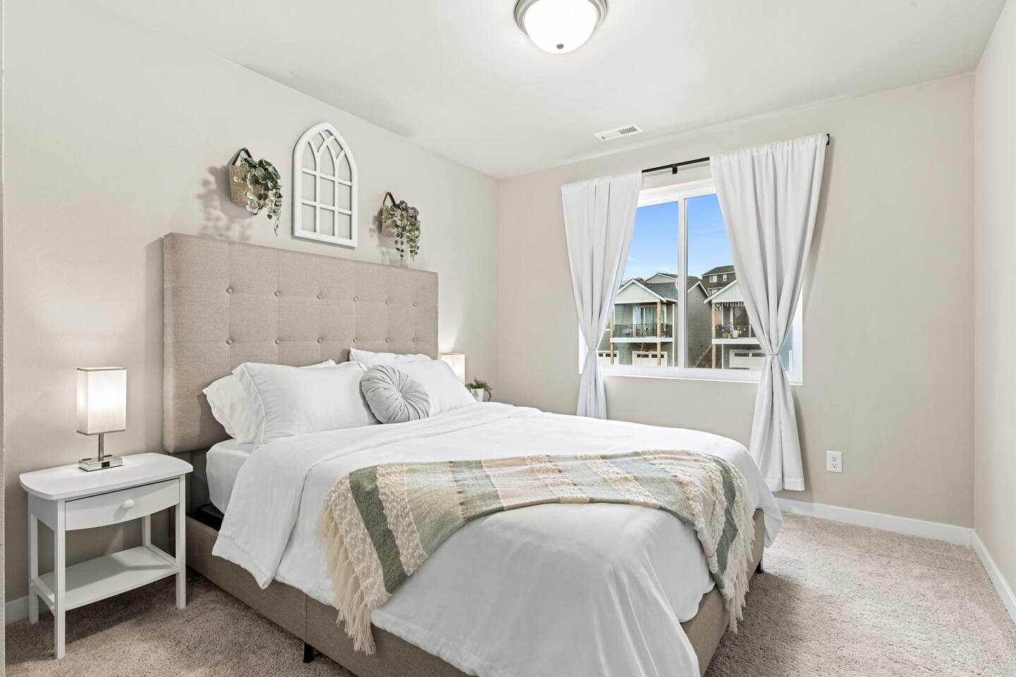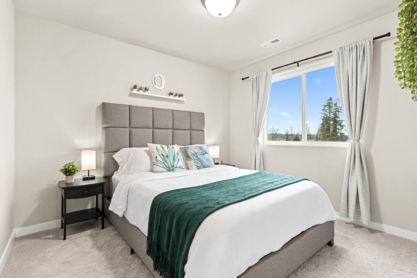 SLEEPING ARRANGEMENTS Second Floor Bedroom 1: King Bed Bedroom 2: Queen Bed Bedroom 3: Queen Bed Living Room 1: Queen Sofa Bed Basement Bedroom 4: King Bed Living Room 2: 3 Queen Air Mattresses 3 Bean Bag Chairs that converts into Full Beds. Look up Cordaroy Bean Bag Bed for more information. Beddings, blankets and extra pillows are all provided. KIDS AMENITIES -2 High Chairs -Plastic plates, cups & cutleries -Baby Bath Tub -Toys -Pack n' Play CHECK-IN The whole house is exclusively for guest use and with the smart lock, check-in is very convenient with no in person contact. THE FEEL Amazing water views on corner lot surrounded by lush greenery! It's in the end of a cul-de-sac which offers extra privacy. Lots of windows throughout the home shower the house with tons of natural light and beautiful views. With its chic modern interiors, brand new furnishings and charming touches, it is a lovely space to unwind and spend time with family and friends. Enjoy the luxurious comfort of this 2,708 spacious home. KITCHEN The kitchen is fully equipped with stainless steel appliances, new cookware, ample spices, plenty of cabinet space and everything you will need to serve meals, bake cookies and casseroles, or host a potluck dinner. There's a dishwasher, microwave, stainless steel sink with garbage disposal, full size stove with oven, full size fridge and freezer. You are also welcome to use other appliances provided such as Keurig coffee maker, rice cooker, electric wine opener and air fryer. It has an island granite countertop that can seat up to four people. THE GREAT ROOM (LIVING & DINING AREA) You will love the great room concept on the main floor providing a very social environment for your family and friends. This home opens to the kitchen and dining room. The living room has a super comfortable sectional couch, gas fireplace and a 70" Smart HD TV. The dining table seats 8 people comfortably. COVERED PATIO Beside the dining room is a door that leads to a wonderful covered patio with a cozy outdoor seating. Enjoy drinking a cup of coffee while watching the peaceful water views and greenery. LAUNDRY ROOM The laundry room is complete with washing machine, dryer, and steamer. Laundry detergent is provided as well. BEDROOMS Upstairs, 3 bedrooms are located. 2 bedrooms upstairs have 2 queen size beds. The master’s bedroom has a king size bed, en-suite bathroom and a walk in closet. Downstairs in the finished basement is a guest suite with a king bed, a full size bathroom and a private recreational room. All beds are super comfy with high thread count bamboo linens. BATHROOMS The Master's en-suite boasts and oversized tile shower with dual shower-head system, a luxurious free standing tub and dual sink. The basement and the guest bathroom both have a bath tub. The main floor has a powder room with a sink and a toilet. Shampoo, conditioner, shower gel, and towels are provided. PARKING Q House has an attached 2 car garage with lots of driveway parking. Work from home. Monthly discount. Group Vacation. Family Vacation